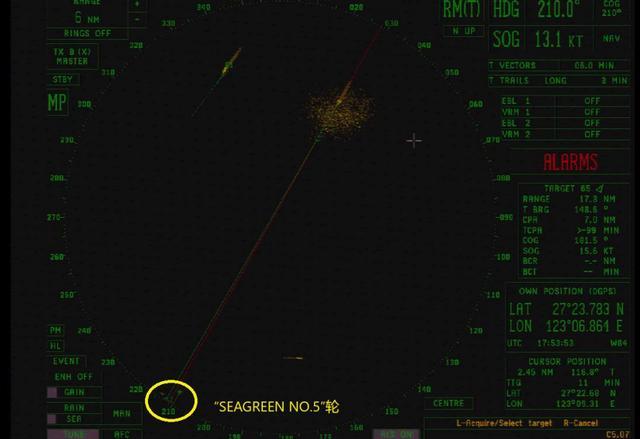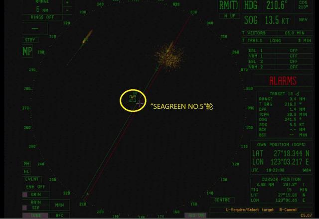 0154时,“YM INITIATIVE”轮船位27°23′.783N/123°06′.864E,航向210,航速13.1节,此时雷达首次探测到位于正前方偏右的不明物标(后被证实为“SEAGREEN NO.5”轮),无AIS信息,航向、航速未知,距离约9.52海里。