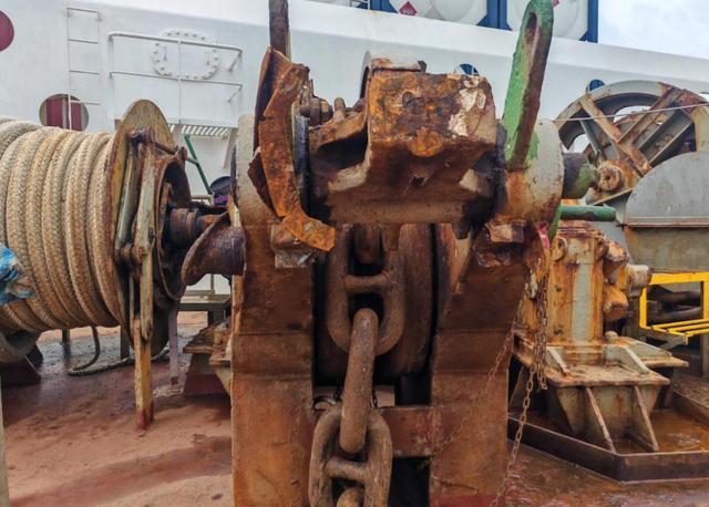 右锚制链器损坏。右锚嵌入被撞驳船,在伴随下沉过程中导致制链器受力过大,外翻并损坏。